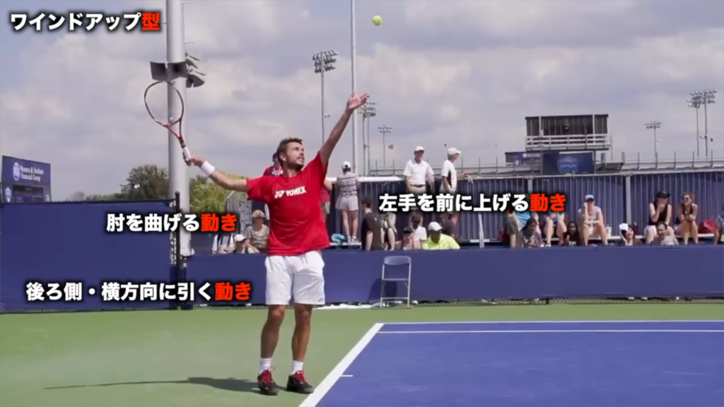 ワインドアップ型は、3つの中で最も大きなスイングになるタイプだ。トスを上げる手(リリースハンド)と打つ側の手(ヒッティングハンド)の両方を同時に下げ、そこから同時に持ち上げながらトロフィーポジションへ入っていく。